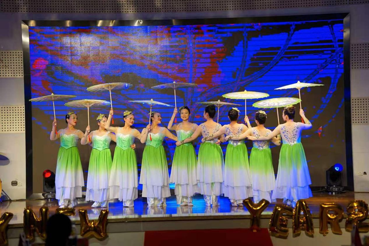 最为震撼和精彩的莫过于舞蹈高潮部分,所有舞者飞向了中心将手里的花伞撑开,共同拼成了一朵硕大而绚烂的茉莉花,盛开在大家的眼前,台下多次掌声响起!来自德国的外教Sonja忍不住赞叹老师们的表演太专业了,给她留下了非常深刻的印象!