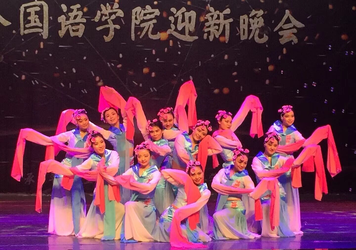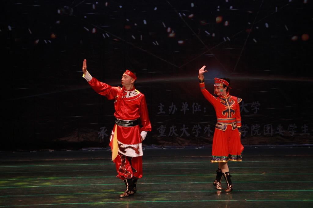 大学英语文理课程组的张津玮老师和德语系的吴娟老师表演。他们褪去课堂上的严肃,带着动人的浅笑,迈着沉稳的舞步,双手似雁,在舞台上勾勒出草原天空的意蕴。曲止舞终,小剧场里传来同学们的阵阵欢呼声。