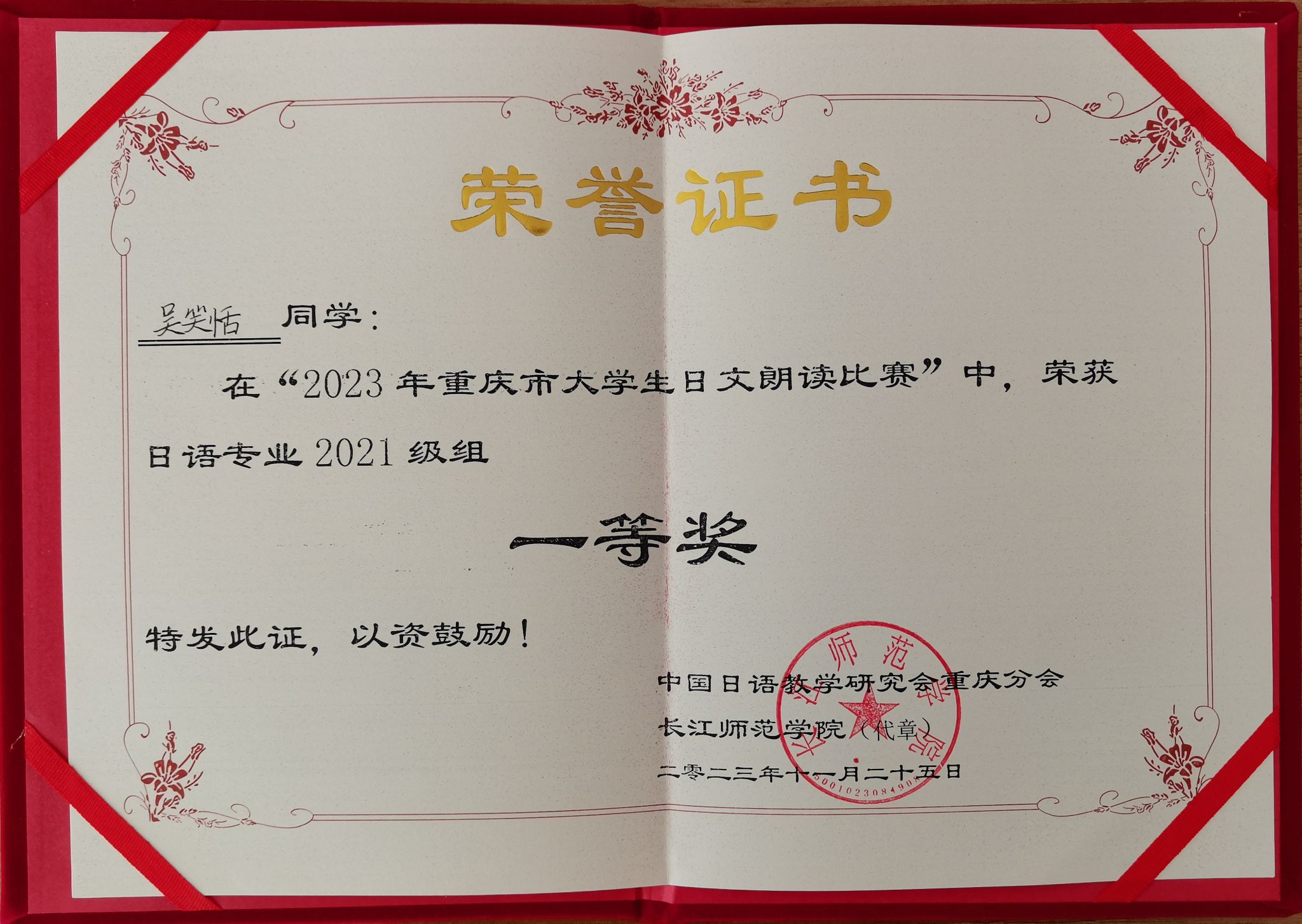 非专业组选手通过录制视频参赛,专业组成绩由自备稿朗读和现场即兴朗读两部分组成。经过激烈地角逐,日语专业吴笑恬同学获21级专业组一等奖,日语专业张跃同学获22级专业组三等奖,英语专业杨证同学获非专业组三等奖。