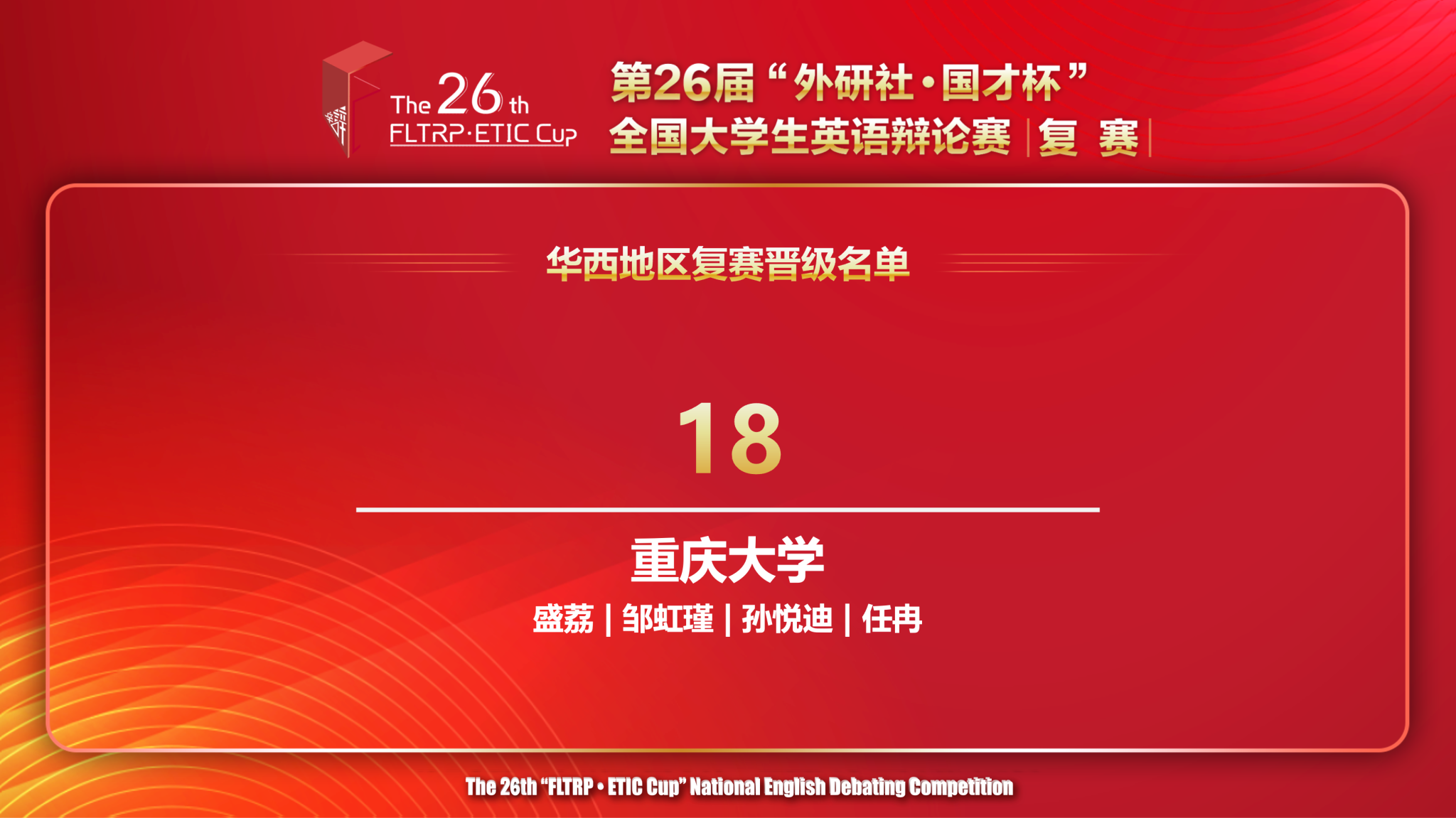 两位辩手面对每轮辩题审慎分析,掷地有声、平稳应对,其立论反驳中对现实话题之关切,展现了重大学子“复兴民族,誓作前锋”的担当,最终以总积分10分的成绩赢得了国赛入场券。