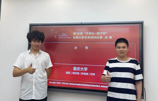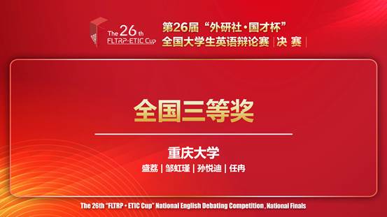 两位辩手经历了区赛的沉淀打磨,面对国赛中更具挑战的辩题谨审慎析,化繁为简、稳扎稳打,凭借扎实的辩论技巧和严谨的逻辑思维与对手进行交锋切磋、据理辩驳,展现出较强的英语语言综合运用能力和夯实的知识储备。二人经过层层较量,凭着默契的配合,最终以全国三等奖的成绩收官本届大赛。