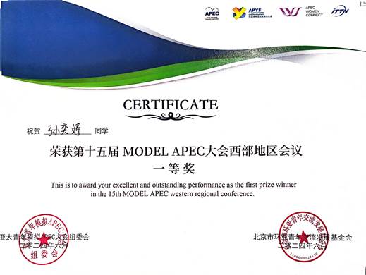 1人荣获一等奖、3人荣获二等奖、1人荣获三等奖,孙奕婷以一等奖的成绩晋级第十五届MODEL APEC全国大会。
