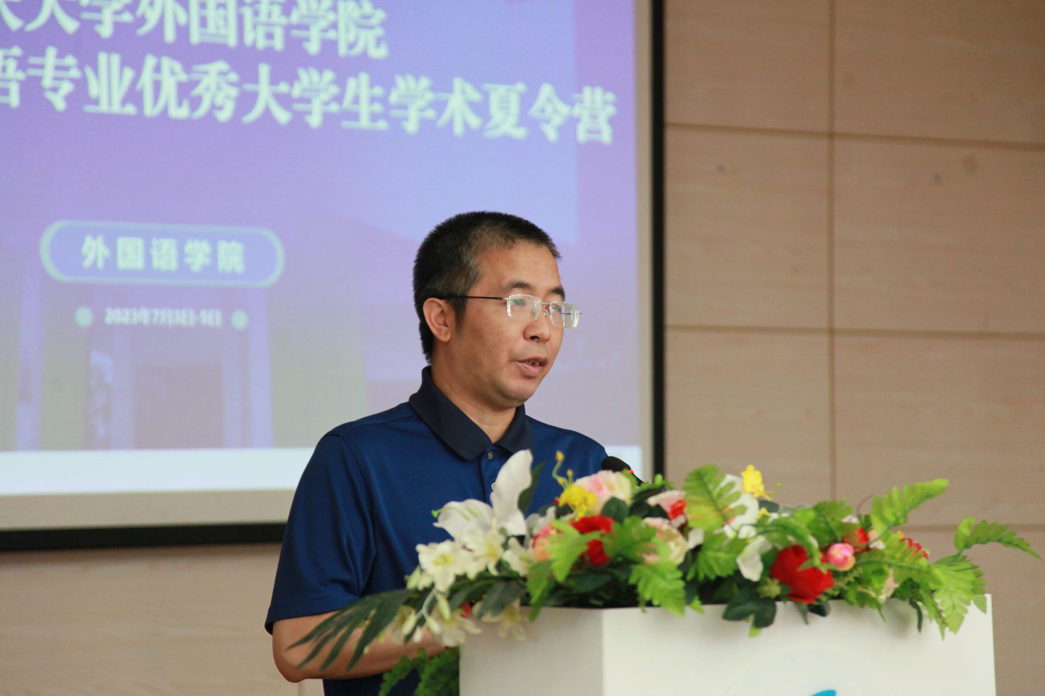 在国际中文教育会场,系主任袁继锋教授介绍了专业的基本情况,中文教育的传统与现实,并以中西观念中不同的语言视角,强调以中文认识世界的重要性,鼓励营员们在AI智能算法所冲击的当下,坚守自我意识和学术理想。
