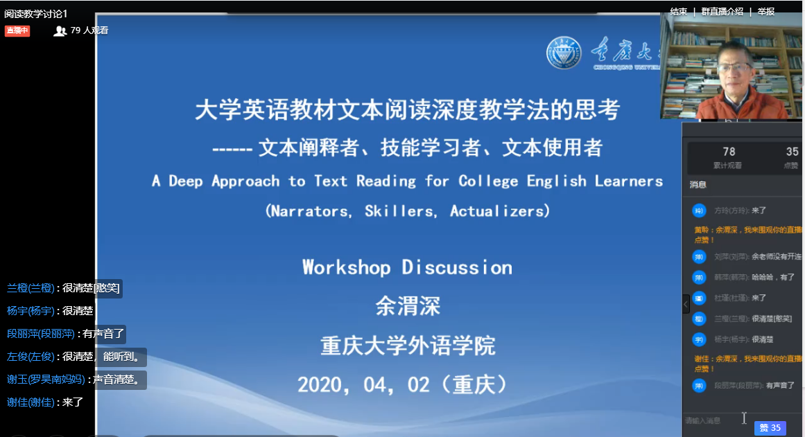 资深教授余渭深老师于2020年4月2日依托钉钉平台举办了名为“大学英语教材文本阅读深度教学法的思考”的教学及研究工作坊。来自本院和重庆市其他高校100多大学英语教师参加了此次线上研讨。在此次工作坊中,余渭深教授引导与会老师从文本阐释者、技能学习者、文本使用者的视角来思考自身在阅读教学设计与实践中的收获与存在的问题。