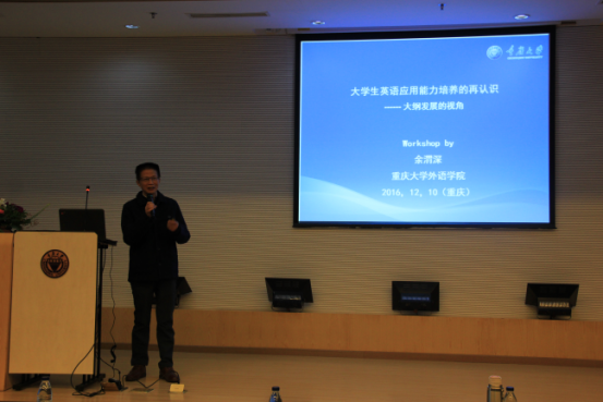 余渭深教授围绕着“大学生英语应用能力培养的再认识------ 大纲发展的视角”展开,指出中国大学英语教育处于转型阶段,因此我们应该对大学英语课程存在的理据、英语教学的目标、英语课程的教育价值进行重新审视,对英语应用能力进行再思考,根据国家对人才的需求、学校的人才培养目标制订校本方案,确定英语课程设置和安排,改革教学方法和模式,真正提高大学外语教学质量。