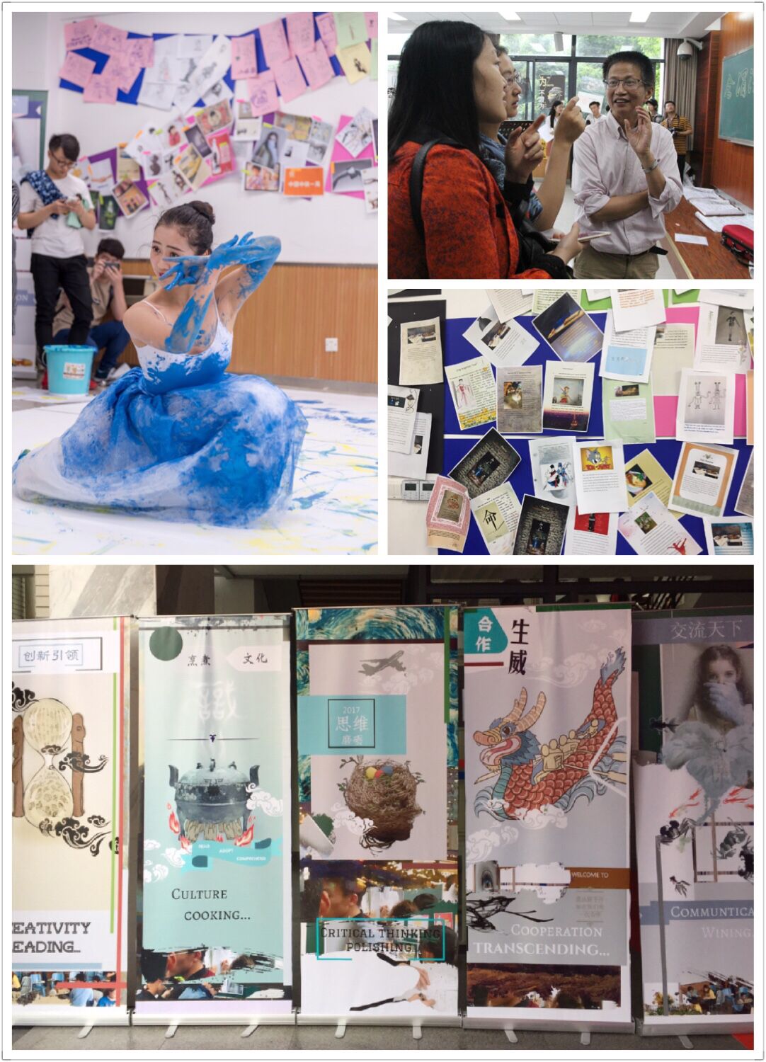 对新大学英语课程方案执行情况的阶段性成果展示,同时也是师生对大学英语课程教与学过程的一次反思。此次活动基于大学英语课程类型共分为15个展室,以多种形式展示课程教学理念、学生学习过程和学习成果。通过静态的学习成果和学生现场表演及陈述,充分展现了18漫画
