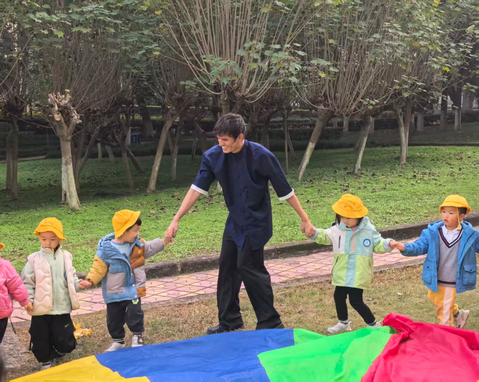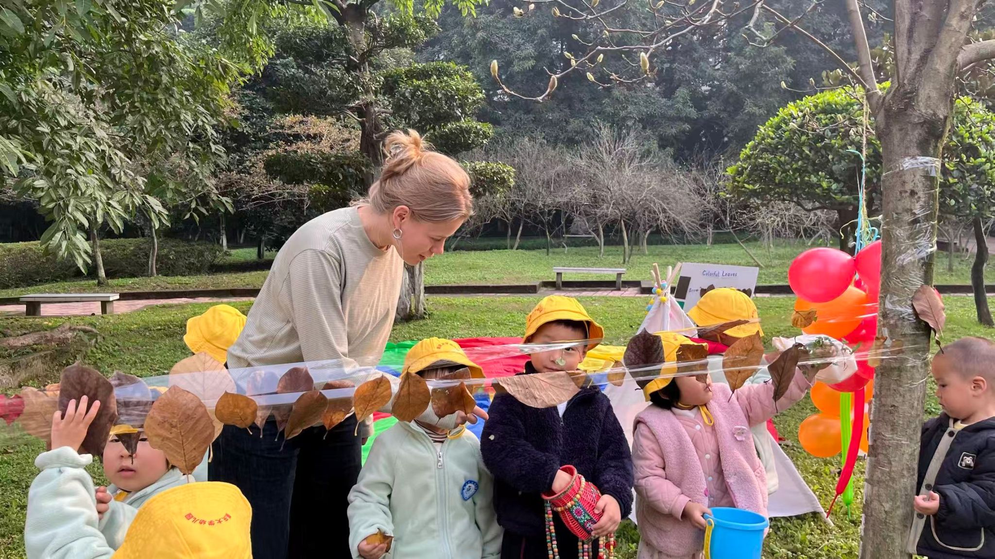 幼儿园开展“与落叶对话”户外沉浸式英语教学活动。留学生辅导员黄恩珂带领三名优秀的留学生志愿者——来自巴西硕士研究生亚瑟、来自哥伦比亚的语言生罗珊珊以及荷兰语言生BLOK MINKA参与了此次活动,通过协助幼儿园教师引导幼儿在自然环境中开展英语互动,助力活动取得圆满成功。