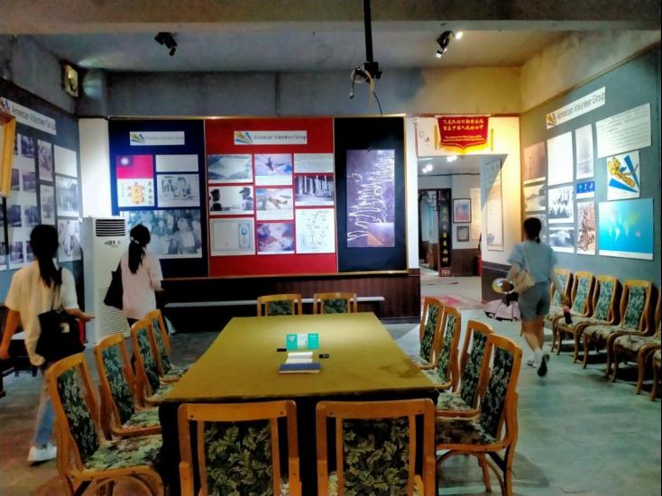 来到飞虎队博物馆门前,就可以看到“援华抗战永志不忘 好汉飞虎中美之光”这样一幅对联。爬上楼梯后可以看到门上贴着有飞虎队形象的年画。自从飞虎队来重庆后,日军的飞机不敢再轰炸重庆,重庆人民把飞虎队队员的形象作为年画贴在门上,以表达尊敬之情。