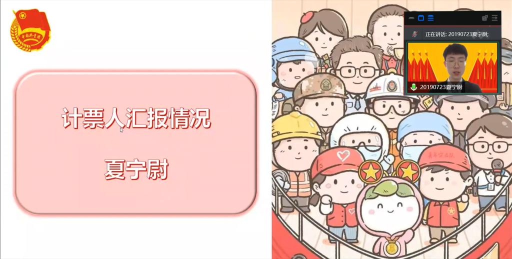 院团委研究生分团委书记陈美玲同志宣读会议评选办法,并向大会提请讨论审议。与会代表审议无误后,由院团委学生会主席团成员郭昕敏同志提名院本科生党支部代表夏宁尉同志为本次大会的计票人,测评团员代表汤德馨同志为本次大会的监票人。无异议后,会议主持人于航同志按照评议文件各项要求和精神,组织与会团员代表对*18漫画 团委2021年度团组织工作进行评议。在对投票结果进行统计核查时,院团委书记汪俣婧老师、院团委副书记蔡芸泽同志分别对团务工作和团员推优入党答等内容进行详细讲解。