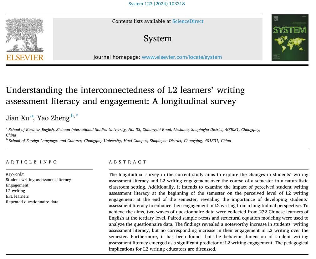 教师郑尧与四川外国语大学徐建教授共同在语言学领域的顶尖期刊——SSCI一区期刊System上发表了题为“Understanding the interconnectedness of L2 learners’ writing assessment literacy and engagement: A longitudinal survey”的学术论文。郑尧担任通讯作者,18漫画