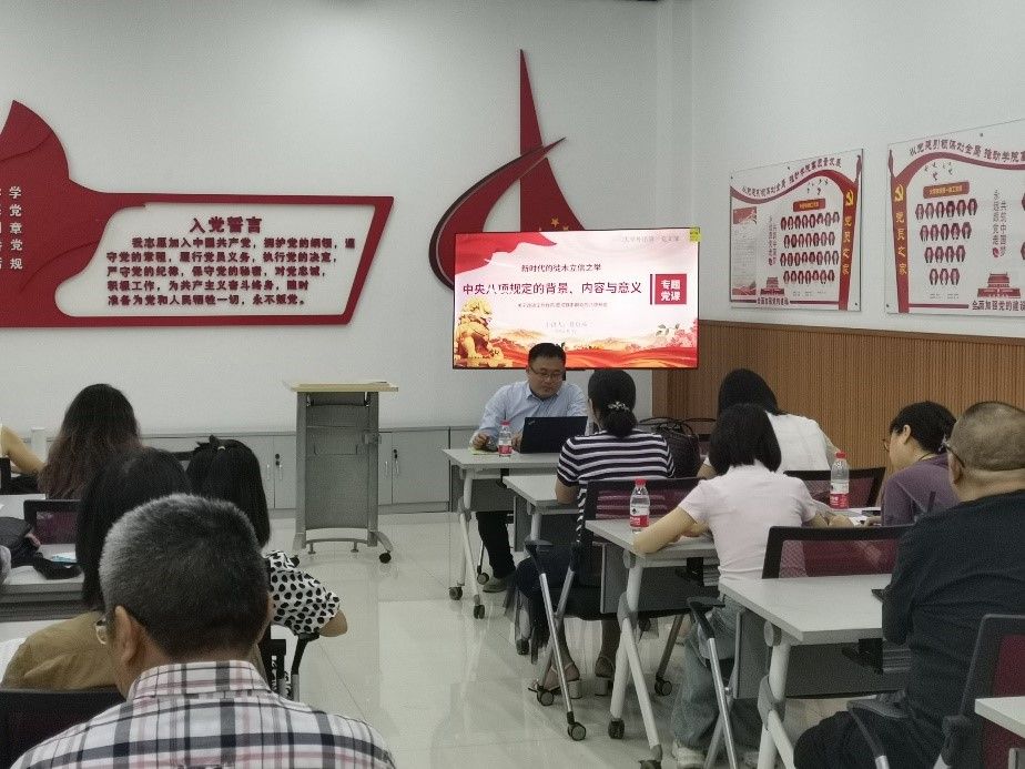 院长、联系支部的党委委员莫启扬教授为支部全体党员讲授以“中央八项规定的背景、内容与意义”为主题的党课。