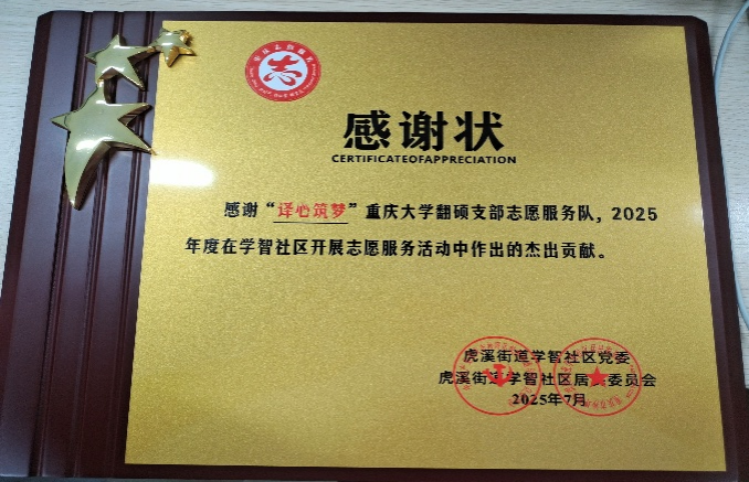 翻硕党支部“译心筑梦”志愿团队联合重庆高新区虎溪街道学智社区,共同开展“阳光学堂”志愿服务项目,为辖区新就业群体家庭子女提供课后托管、学业辅导及兴趣拓展服务。7月1日,项目总结表彰会在学智社区举行,志愿者团队获颁“感谢状”及志愿服务证明。