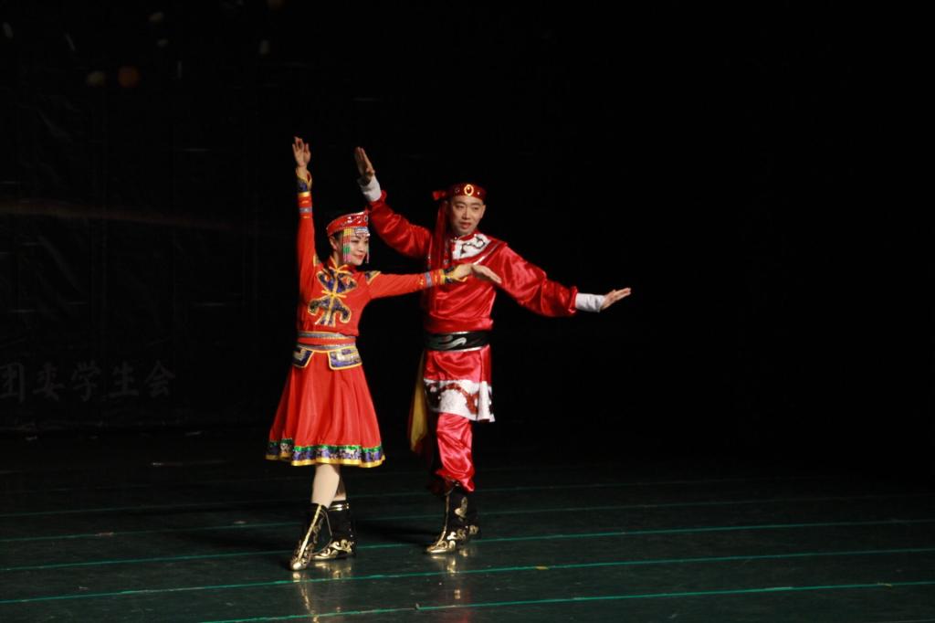 大学英语文理课程组的张津玮老师和德语系的吴娟老师表演。他们褪去课堂上的严肃,带着动人的浅笑,迈着沉稳的舞步,双手似雁,在舞台上勾勒出草原天空的意蕴。曲止舞终,小剧场里传来同学们的阵阵欢呼声。