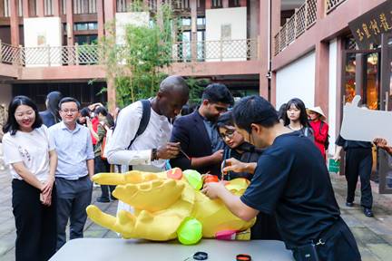 下午五点半,国际学生前往玉皇村龙灯彩扎基地体验龙灯彩扎非遗技艺。铜梁龙灯彩扎是一种以龙文化为主体的灯彩艺术,是具有千年历史传承的传统技艺。国际学生围绕在非遗传承人身边,详细了解了彩扎的工艺、历史、美术作品等,并在非遗传承人的指导下,动手参与龙灯彩扎,从中体会中国非遗文化的匠心工艺。