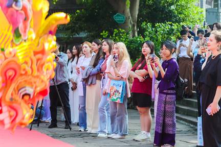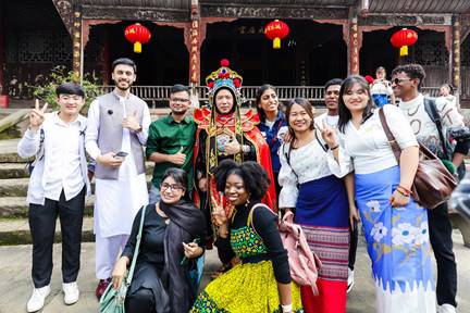 中午时分,国际学生在品尝当地特色美食后,游览打卡“中国第四大古城”全国非遗旅游景区——安居古城。国际学生走在街道小巷中欣赏着安居古城造型各异的中式特色房屋建筑,在近距离观看川剧“变脸”中感受中国艺术瑰宝之奇,在铜梁龙舞的惊艳表演中感叹精湛多彩的艺术特色。