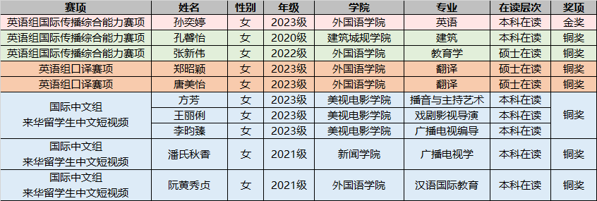 选手凭扎实的外语功底与出色的跨文化交际能力,在英语组国际传播综合能力赛项、口译赛项以及国际中文组留学生中文短视频赛项三大赛项中获得金奖1项、铜奖7项。