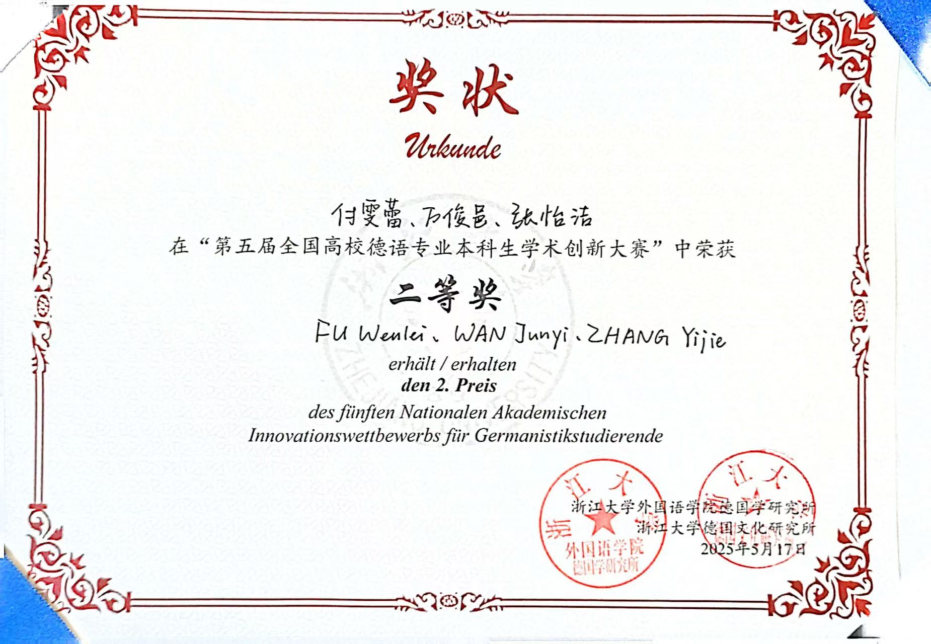 代表队由2022级德语专业本科生付雯蕾、张怡洁和万俊邑组成。在比赛中,三位同学凭借扎实的专业知识、创新的学术思维和出色的团队协作能力,荣获全国二等奖。