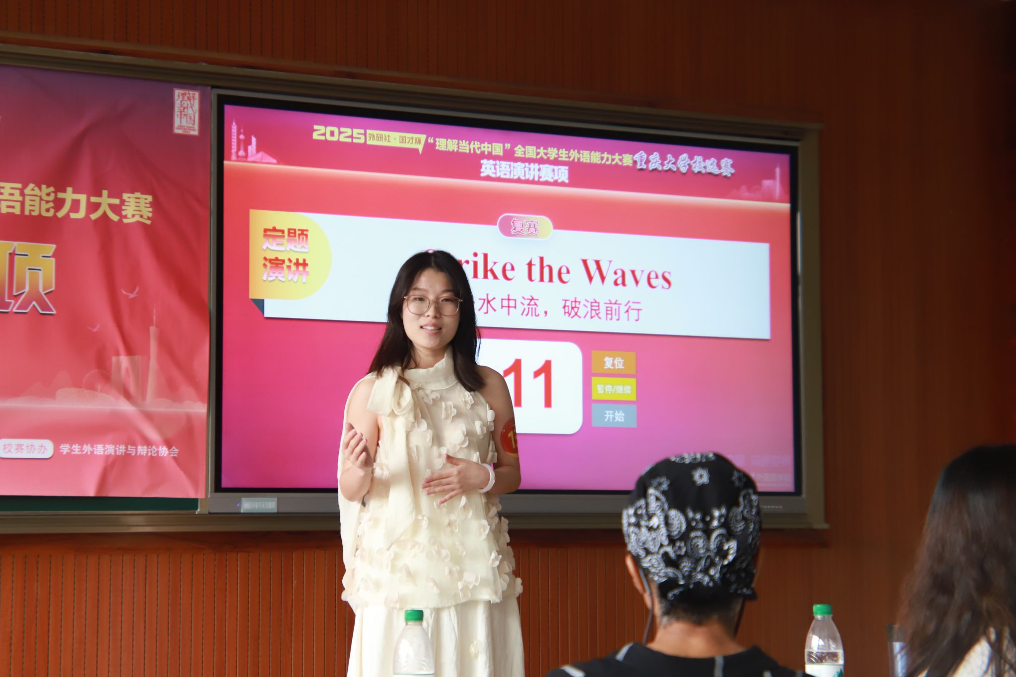 复赛分3分钟定题演讲、2分钟即兴演讲两个环节进行。选手们从个人经历、社会热点等多角度切入主题“Strike the Waves”展开论述,从青年在时代浪潮中的非遗数字化传承实践,到模拟联合国大会上为小岛屿国家发声的经历,诠释出对“勇立潮头、敢拼敢闯”的深刻理解。即兴演讲环节设有“君子和而不同”“千里之行,始于足下”“知人者智,自知者明”三个题目,选手们根据抽到的题目,结合自身经历与感悟,用生动实例阐述其独到见解。经过激烈角逐,13名选手以综合表现优势晋级决赛。