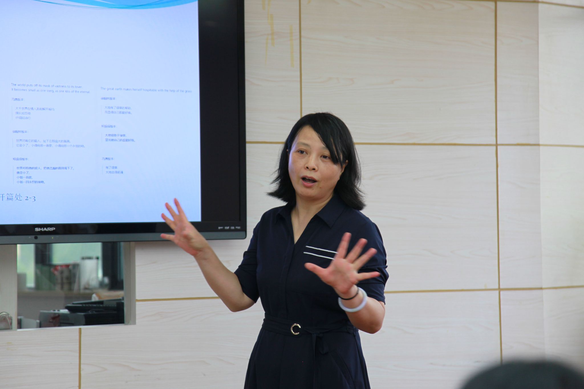 在翻译会场,余泽梅副教授以冯唐的译文为例,指出翻译不仅是目光所及的文本,还有译者所处的时代语境。随后详细讲述了泰戈尔译本在世界流行的原因,以及泰戈尔在中国形象的窄化。