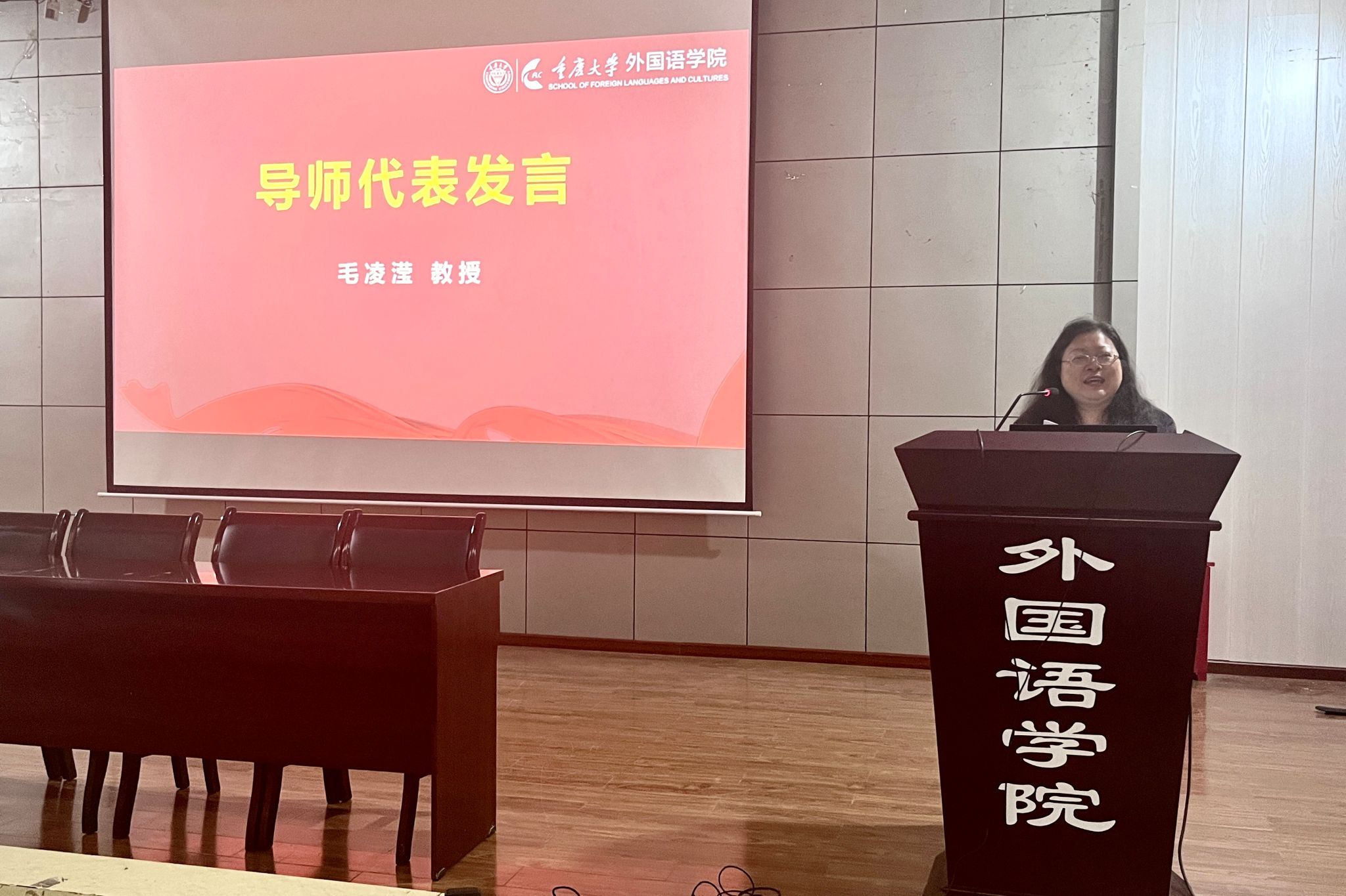 导师代表毛凌滢教授发言,她讲到研究生阶段应该做不重复前人的“真学问”,怀揣信心、耐心和好奇心,培养独立思考的能力和批判精神。了解学科差异、深耕专业领域,以至诚之心打磨自身。