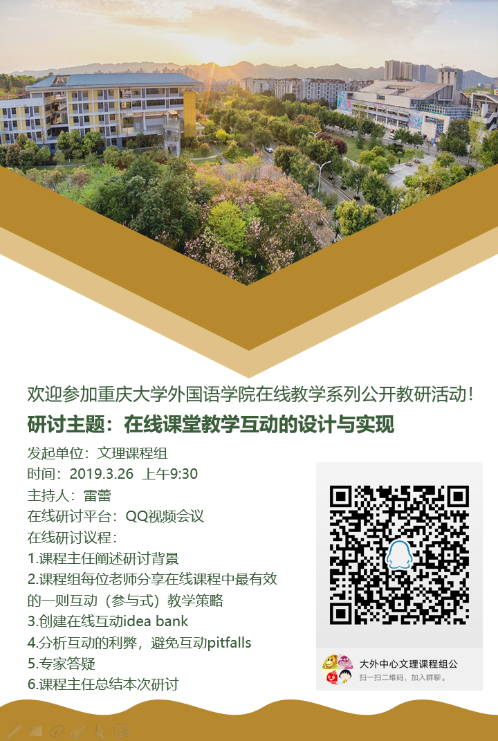 本次公开教研活动的主题为“在线课堂教学互动的设计与实现”,议程有三项:一、课程组教师互动设计分享;二、课程主任总结互动的利弊及设计原则;三、教学专家点评及指导。