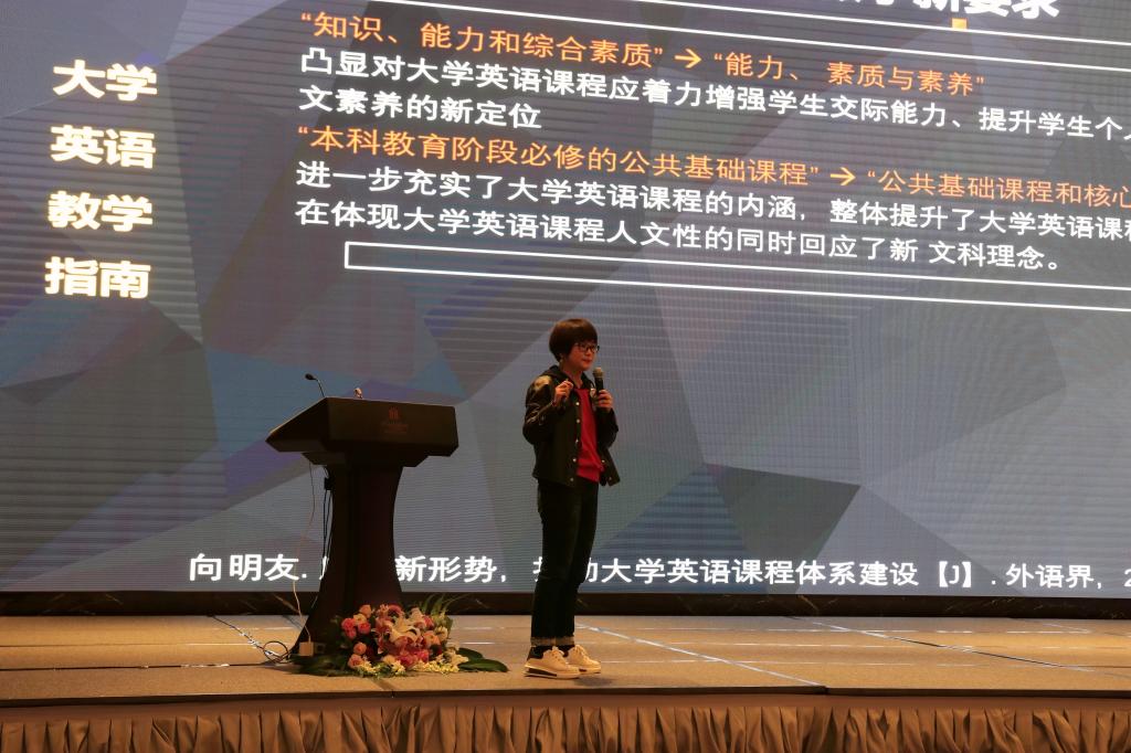 随后,教育部大学外语教学指导委员会委员赵雯教授做了主题发言“基于《大学英语教学指南》的大学英语能力建构:教学目标和要求部分修订说明”。赵雯教授指出,本次《指南》教学目标与要求的修订,突出对学生综合文化素养和高阶认知能力的培养,在教学目标、内容、手段等方面,都对教学提出更高要求。此外,赵雯教授通过差距性需求分析,对教学要求部分语言能力的描述参数进行了充实,对三个等级目标的语言能力描述语进行了修订与完善。赵雯教授表示,基于大学英语学习者的实证研究将会进一步从理论、方法和实践层面不断改进与完善《指南》的教学目标与教学要求,使之发展成为更具特色的校本课程与个性化的实施课程。